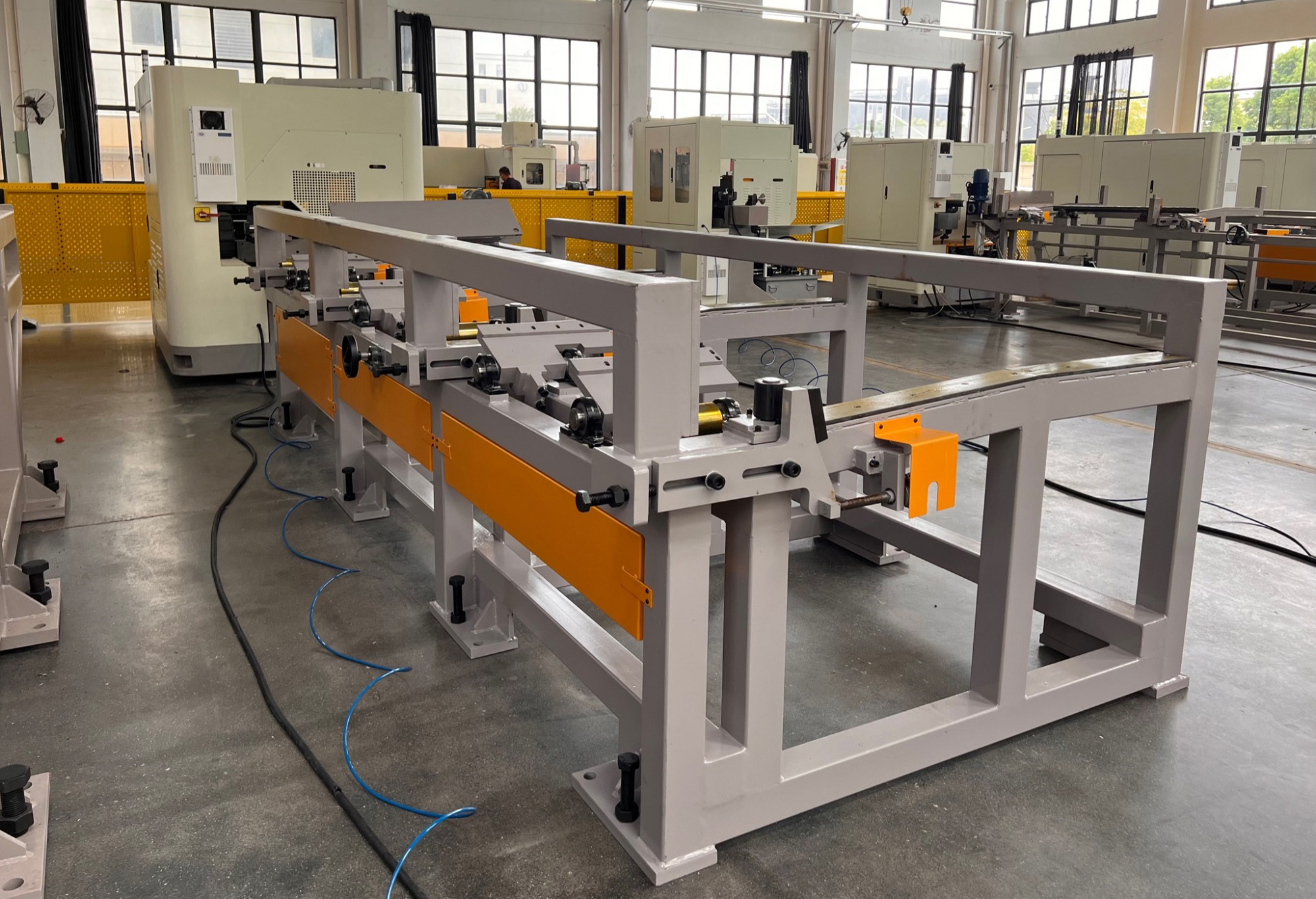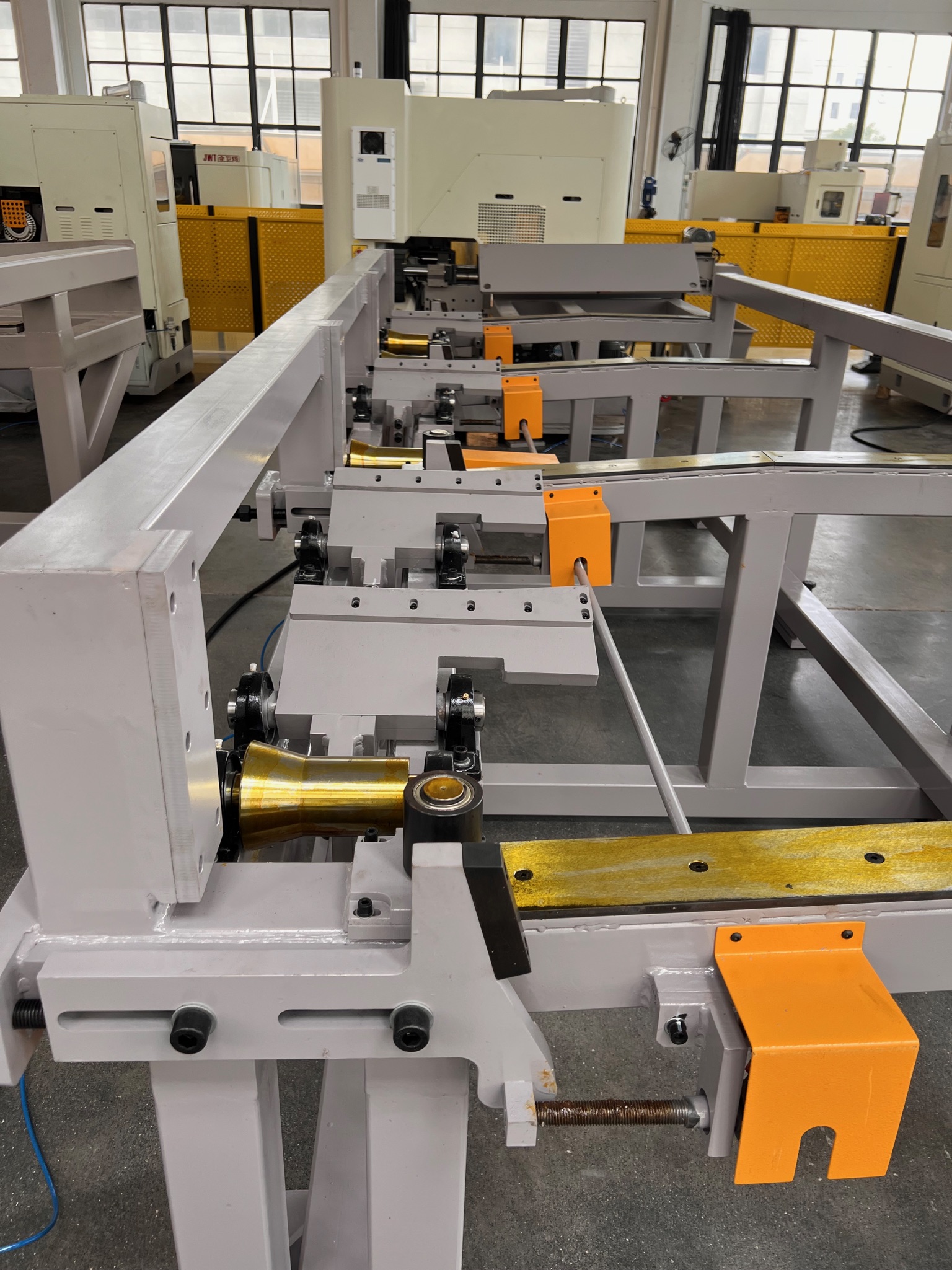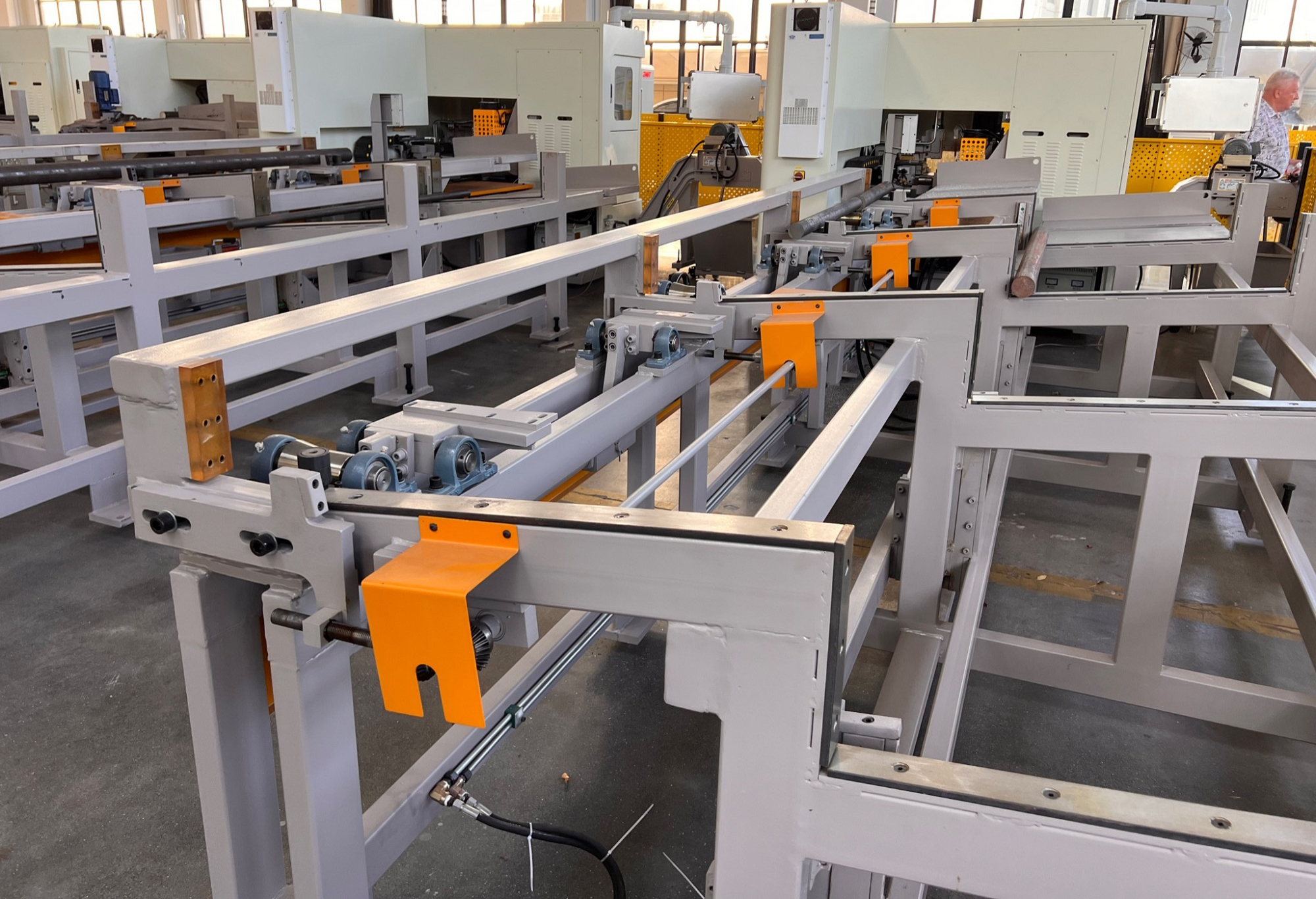 - Хранение стержневого материала, поворотная подача (без ударная) одиночного стержневого материала в зажимные тиски основной машины. Механизм подачи основной машины осуществляет подачу материала фиксированной длины с помощью группы плоских роликов и группы боковых роликов.